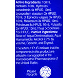 Ingredients : Hydrastis 4x (10 ml), petroleum 8x, thuja 10x, lycopod pulsatilla 3x, mezereum 3x, ephedra 3x, ephedra 3x (in a base of aqua hammamelidis, aqua dem, thymol, and glycerin. Contains 7.7% ethyl alcohol.