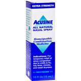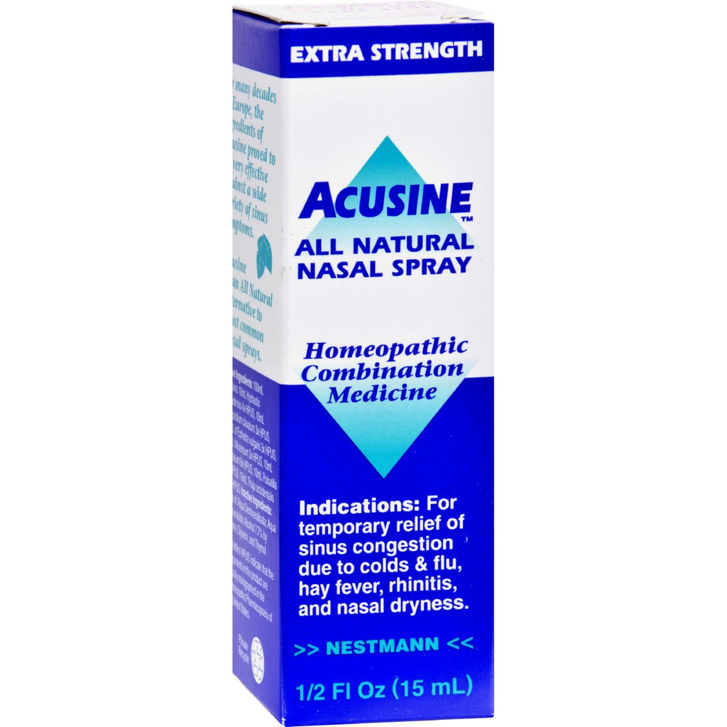 Extra Strength All Natural Homeopathic Combination Medicine Easy To Use 1-Way Metered Dose Pump Spray Indications: For temporary relief of sinus congestion due to colds and flu, hay fever, rhinitis, and nasal dryness. This all natural product has been formulated to normalize breathing unplug stuffy nose decrease inflammation prevent nasal drying. For many decades in Europe, the ingredients of Acusine proved to be very effective against a wide variety of sinus symptoms. Acusine is an all natural alternative to most common nasal sprays.