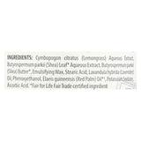 ingredients : aqueous extract;ascoric acid;butter;butyrospermum parkii;cymbopogon citratus;elaeis guineensis;emulsifying wax;lavandula hybrida;lavender;leaf* aqueous extract;lemongrass;oil;oil*†;phenoxyethanol;potassium sorbate;read palm;shea;stearic acid
