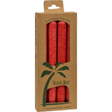 Aloha Bay Palm Tapers Red Description: Distinguish your home naturally with the crystalline beauty of Palm Wax Pure Vegetable Palm Wax 4 Unscented Tapers Burn Time: 9 hrs 9" Tall Eco Palm Wax from United Plantations and Golden Hope Plantations is no threat to rainforests or orangutans' ecosystems. We prefer palm based candles to genetically modified, chemically distilled, commercially grown soy wax. Palm oil uses one-tenth of the land as compared to soy production and is a sustainable tree crop that enhances biodiversity and carbon sequestering. In 1993, Aloha Bay began manufacturing and wholesaling hand dipped paraffin tapers, painted with palm wax. These beautiful tapers are still popular in the gift industry. And in 1997, we developed the first 100% Palm Wax votives and richly scented jar candles. Over the years, we have expanded our use of pure essential oils and have become a wholesale supplier to the natural food industry. Aloha Bay has continued to experiment with every type of vegetable wax (soy, coconut, rice bran, carnauba, candelilla, bayberry, jojoba and even castor oil). We have found that palm wax makes the best candles. Most vegetable waxes (e.g. soy wax) are too soft and oily to be used by themselves, so they are often mixed together with large percentages of palm wax. Disclaimer These statements have not been evaluated by the FDA. These products are not intended to diagnose, treat, cure, or prevent any disease.