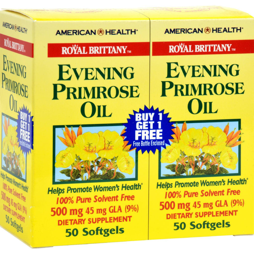 American Health Royal Brittany Evening Primrose Oil Twin Pack Description: Helps Promote Women's Health-- 100% Pure Solvent Free-- 45 mg GLA (9%)-- Buy 1 get 1 FREE Bonus Pack For centuries, women of all ages have depended on the reliability of Evening Primrose Oil. EPO contains one of the richest sources of Gamma-Linolenic Acid (GLA - 45 mg per serving), a fatty acid not commonly found in food.Popular with women of all ages, EPO helps provide nutritional support for women with PMS.Royal Brittany's EPO is the best product of its kind on the market. The EPO used for Royal Brittany is 100% natural, cold pressed, organically cultivated on protected, pesticide-free growing fields and is void of Hexane and all other solvent residue. Royal Brittany's EPO assures quality, reliability, and purity. Free Of Yeast, Wheat, Milk or Milk Derivatives, Lactose, Sugar, preservatives, soy, Artificial Flavor, color and sodium(less than 5 mg per serving). Disclaimer These statements have not been evaluated by the FDA. These products are not intended to diagnose, treat, cure, or prevent any disease.