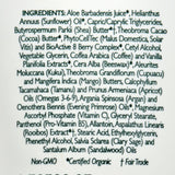 Ingredients : Aloe Barbadensis Juice*, Aqua, Helianthus Annuus (Sunflower) Oil*, Capric/Caprylic Triglycerides, Butyrospermum Parkii (Shea) Butter*, Theobroma Cacao (Cocoa) Butter*, Cetyl Alcohol, Sodium Alginate, Vegetable Glycerin, Coffea Arabica (Coffee) and Vanilla Planifolia Extracts*, Cera Alba (Beeswax)*, Theobroma Grandiflorum (Capuacu) and Mangifera Indica (Mango) Butters, Calophyllum Inophyllum (Tamanu) Oil, Malus Domestica (Apple), Solar Vitis (Grape) and Vaccinium Myrtillus (Bilberry) Fruit Stem Cell Cultures and BioActive 8 Berry Complex*, Oenothera Biennis (Evening Primrose) Oil*, Prunus Armeniaca (Apricot) Oil, Glyceryl Stearate, Panthenol (Pro-Vitamin B5), Allantoin, Aspalathus Linearis (Rooibos) Extract*, Stearic Acid, Ethylhexylglycerin, Phenoxyethanol, Salvia Sclarea (Clary Sage) and Santalum Album (Sandalwood) Oils.