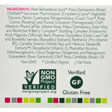 Ingredients : Aloe Barbadensis Juice*, Rosa Damascena (Rose) Distillate*, Vaccinium Macrocarpon (Cranberry) Juice*, Vegetable Glycerin, Pectin, Cyamopsis Tetragonolobus (Guar) Gum*, Rosa Canina (Rosehip) and Punica Granatum (Pomegranate) Oils*, Allantoin, PhytoCellTec (Alpine Rose, Malus Domestsica, Solar Vitis) and BioActive 8 Berry Complex*, Soothing Complex: [Hyaluronic Acid, Magnolia Officinalis Bark, Phoenix Dactylifera (Date) Leaf Cell and Boswellia Serrata (Boswellin) Extracts], Panthenol (Pro-Vitamin B5), Camellia Sinensis (White Tea) and Hibiscus Sabdariffa Extracts*, Tocopherol (Vitamin E), Phenethyl Alcohol, Ethylhexylglycerin, Citrus Tangerina (Tangerine) and Pelargonium Graveolens (Rose Geranium) Oils*, Rosa Centifolia (Rose) Oil. Non-GMO verified *Organic Fair Trade We champion Certified Organic, Natural Origin, BioActive, Fair-Trade, Verified Gluten-Free, Non-GMO Project Verified, Vegetarian and Vegan Ingredients, Eco-Friendly Practices, and a Meaningful No Animal Testing Policy. We reject GMO's, Petrochemicals, Phthalates, Sulfates, Synthetic Colors, Dyes, Fragrances, Triclosan, PEG, MEA, TEA, DEA, or Paraben Preservatives.