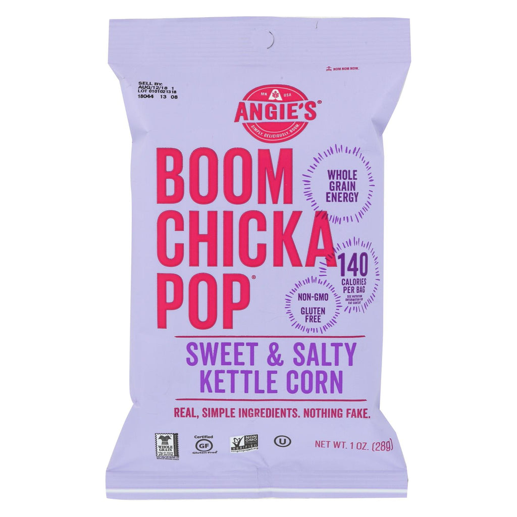 Angie's boomchickapop kettle corn, sweet & salty is a snack you can feel good about. This flavorful kettle corn is made with real ingredients found in a kitchen, not in a lab. A snack packed with energy, not guilt, this kettle corn is kosher, vegan, gluten-free and non-gmo. This kettle corn is packed in bright bags that radiate all the love and fun that went into them from the beginning. Each bag of angie's boomchickapop kettle corn, sweet & salty contains 1 oz. Of always real kettle corn.