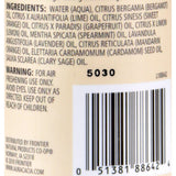 Ingredients : Water (aqua), citrus bergamia (bergamot) oil, citrus x aurantifolia (lime) oil, citrus sinesis (sweet orange) oil, citrus x paradisi (grapefruit) oil, citrus x limon (lemon) oil, mentha spicata (spearmint) oil, lavandula angustifolia (lavender) oil, citrus reticulata (mandarin orange) oil, elettaria cardamomum (cardamom) seed oil, salvia sclarea (clary sage) oil.