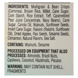 ingredients : multigrain & bean crisps;cornmeal;brown rice;millet;cane sugar;corn starch;rice extract;teff;caramelized pear juice concentrate;navy beans;canola oil;walnuts;sunflower seeds;invert cane sugar;raisins;sunflower oil;dried apples;flax seeds;sesame seeds;cinnamon;natural flavors;sea salt