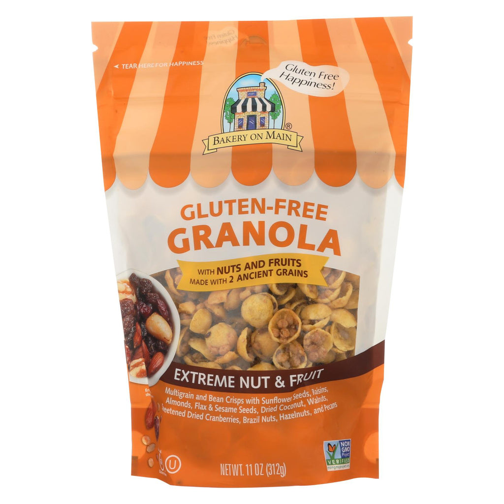 Bakery on main extreme nut and fruit gluten-free granola is a nutrient-packed medley you need to revamp your breakfast routine. Bakery on main uses 9 different types of seeds and nuts with dried cranberries, coconut and raisins for added flavor. Two ancient grains are added for an extra boost to this multigrain granola. With no cholesterol and the high-magnesium grain millet, protecting your heart is easy and delicious. Teff is added to strengthen bones and help manage weight. Try this non-gmo and gluten-free granola with yogurt, as an ice cream topping or snack straight from the bag. Includes one 11 oz. Package. See nutrition facts panel for allergens. At bakery on main, our mission is to create delicious and fearlessly unique gluten-free products. We want all our customers to be happy and healthy. We don't believe a food allergy should prevent great taste.