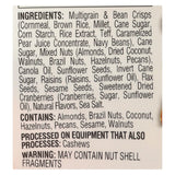 ingredients : multigrain & bean crisps;cornmeal;brown rice;millet;cane sugar;corn starch;rice extract;teff;caramelized pear juice concentrate;navy beans;mixed nuts;almonds;dried coconut;walnuts;brazil nuts;hazelnuts;pecans;canola oil;sunflower seeds;invert cane sugar;raisins;sunflower oil;flax seeds;sesame seeds;sweetened dried cranberries;cranberries;sugar;natural flavors;sea salt