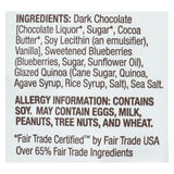 ingredients : dark chocolate [chocolate liquor;sugar;cocoa butter;soy lecithin;an emulsifier;vanilla];sweetened blueberries;blueberries;sunflower oil;glazed quinoa;cane sugar;quinoa;agave syrup;rice syrup;salt;sea salt