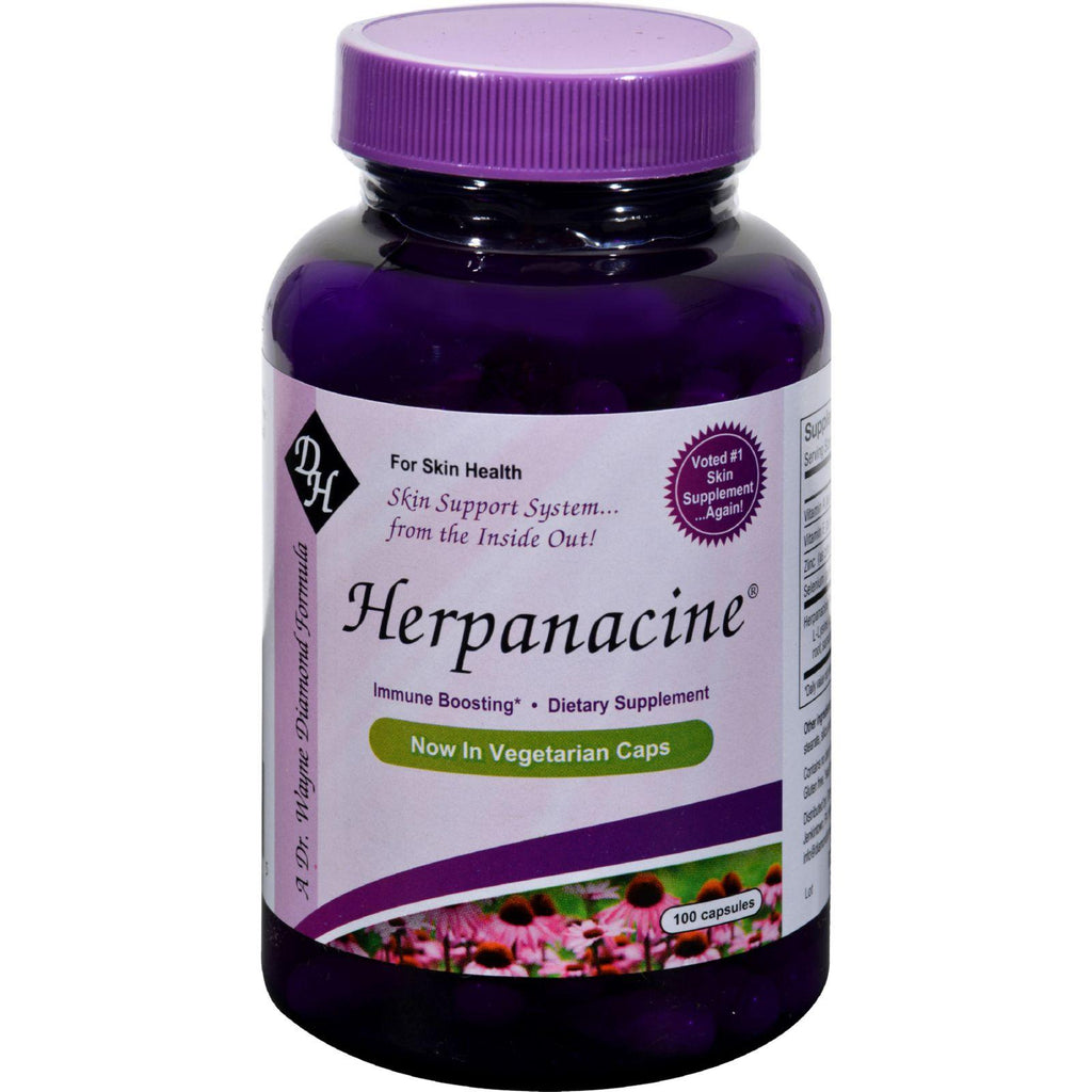 Diamond-Herpanacine with Antioxidants Description: Total Skin Support System... from the Inside Out! Voted number 1 Skin Supplement Now in Veggie Caps Plus Zinc Herpanacine, nature's answer to skin health, is the brainchild of Dr. Wayne Diamond, a holistic doctor and psychotherapist who has worked in the healthcare field for more than 22 years. Dr. Diamond has extensive experience researching immune, skin and cardiovascular health.Herpanacine, which has been on the market since 1990, is a nutritional supplement used to promote skin health. It consists of a synergistic blend of nutrients that support the skin.Working to balance the overall body chemistry, Herpanacine helps to naturally cleanse the skin's layers, rid the body of toxins and strengthen the immune system so it might better defend the body from foreign invaders.This unique supplement was researched and developed in trials spanning nearly a decade. Dr. Diamond worked with patients suffering from poor skin health to perfect his formulation of vitamins, herbs and antioxidants that support healthy immune function and skin appearance.In addition to better skin, users also report enhanced energy, stamina, and improved overall health.Herpanacine is manufactured using high-quality ingredients that have been safely formulated and processed in an FDA-licensed facility for superior benefits and results.Herpanacine's Proprietary Blend consists of: L-Lysine (as L-Lysine HCI), L-tyrosine, astragalus root, dandelion root, sarsaparilla root, Echinacea (aerial parts) and ligustrum berry.Experience the dramatic difference this exceptional formula will make!03707-D01AA Free Of Yeast, dairy, corn, wheat, sugar, artificial preservatives, flavor or color. Disclaimer These statements have not been evaluated by the FDA. These products are not intended to diagnose, treat, cure, or prevent any disease.