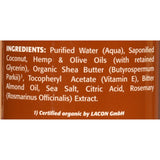 Ingredients : water, saponified coconut, hemp and olive oils with retained glycerin, organic shea butter (butyrospermum parkii), vitamin e oil (tocopheryl acetate), bitter almond oil, sea salt, citric acid, rosemary (rosmarinus officinalis) extract