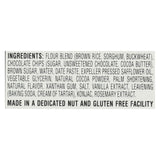 ingredients : flour blend;brown rice;sorghum;buckwheat;chocolate chips;sugar;unsweetened chocolate;cocoa butter;brown sugar;water;date paste;expeller pressed safflower oil;vegetable glycerin;natural cocoa powder;palm shortening;natural flavor;xanthan gum;salt;vanilla extract;leavening;baking soda;cream of tartar;konjac;rosemary extract