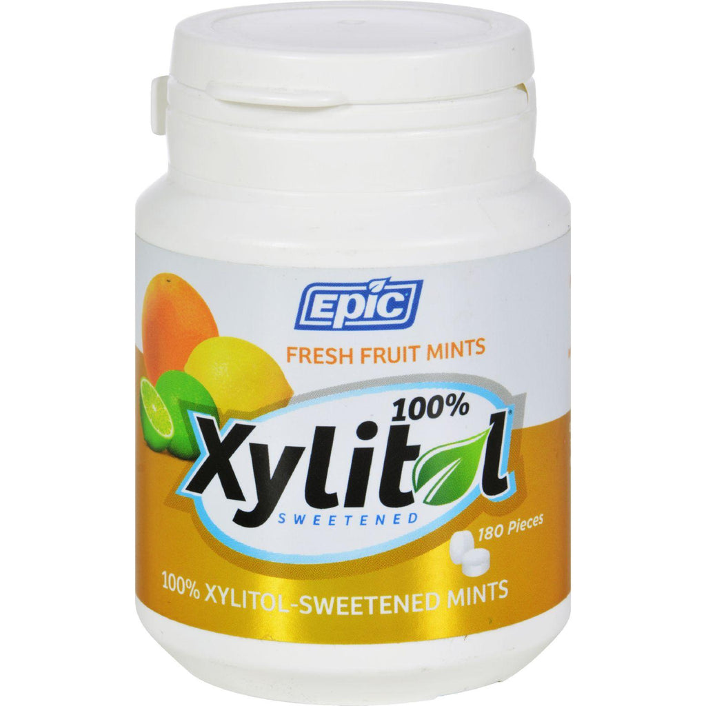 So irresistible, youll want to keep a bottle in your car, your desk drawer AND your briefcase. Sugar-free and sweetened exclusively with xylitol, Epic's Fresh Fruit Mints give a little kick to your daily 6 grams of xylitol that dentists worldwide recommend to help stop tooth decay. Were perfect for those whove always picked the orange tic tacs and youre assured, too, that those with lesser palettes than yours will shy away - too timid to step up to the fruity-healthy-minted plate. DETAILS Perfect Size for Cupholder or Desk Drawer 100% Xylitol-Sweetened Contains NO Aspartame Natural Citrus Flavors, Contains NO Mint
