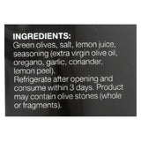 ingredients : green olives;salt;lemon juice;seasoning;extra virgin olive oil;oregano;garlic;coriander;lemon peel