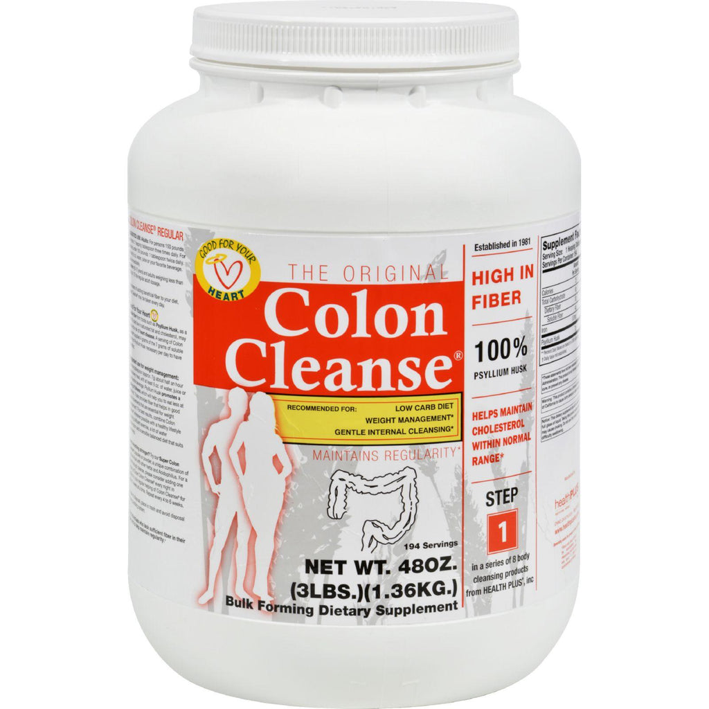 Health Plus The Original Colon Cleanse Description: Colon Cleanse has been the number 1 product in its class for over 3 decades. Each serving supplies 24% daily value of fiber Maintains a healthy heart Doctor Recommended Naturally absorbs toxins in the colon Cleanses the lining of the intestine Mixes well with water or juice Maintains regularity All Natural No fillers or binders Enjoy the benefits of Colon Cleanse, made from 100% Psyllium Husk! Psyllium husk is a soluble fiber. Soluble fiber reacts by absorbing water in the intestine, creating a gel substance. During this reaction Colon Cleanse aids in: a healthy digestive system, heart health, weight management, regularity, and detoxification of the colon. The body's first line of defense is a healthy colon. However, our internal detoxification process can break down from: overexposure to environmental pollutants in our air, food and water, poor diet, lack of adequate fiber, excessive alcohol and caffeine, high stress, lack of exercise, and/or overuse of anti-biotics and prescription medications. These produce a state of toxicity, and COLON CLEANSE then becomes one of the most important steps in detoxification. Disclaimer These statements have not been evaluated by the FDA. These products are not intended to diagnose, treat, cure, or prevent any disease.
