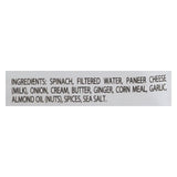 ingredients : spinach;filtered water;paneer cheese;milk;onion;cream;butter;ginger;corn meal;garlic;almond oil;nuts;spices;sea salt