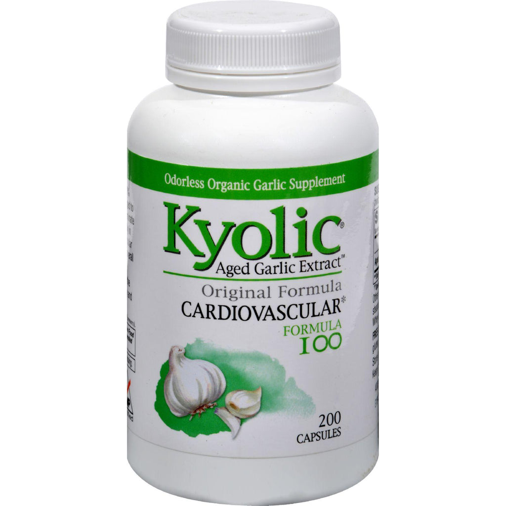 Kyolic Aged Garlic Extract Cardiovascular Formula 100 Description: Original Formula Cardiovascular Health, Cholesterol Levels Immune Function, Liver Function and Nerves Odorless Organic Garlic Supplement Kyolic Aged Garlic Extract begins with 100% organically grown garlic bulbs. They are then aged to perfection in a unique extraction process to eliminate odor and create beneficial compounds found only in Kyolic. This formula supports your cardiovascular system by maintaining circulatory function and overall heart health. Take the best - Kyolic Aged Garlic Extract, the most scientifically researched, highest quality and best-selling odorless Sociable Garlic Free Of Yeast, sodium. Disclaimer These statements have not been evaluated by the FDA. These products are not intended to diagnose, treat, cure, or prevent any disease.