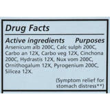 Ingredients : arsenicum alb 200c, calc sulph 200c, carbo an 12x, carbo veg 12x, cinchona 200c, hydrastis 12x, nux vom 200c, ornithogalum 12x, pyrogenium 200c, silicea 12x (symptom relief for stomach distress) inorganic alcohol 20% v/v, purified water