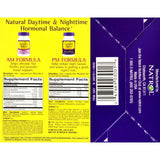 Ingredients : AM FORMULA: Thiamin (Vitamin B1) (as Thiamin HCl) 3 mg, Riboflavin (Vitamin B2) 3.4 mg , Vitamin B6 (as Pyridoxine HCl) 4 mg, Folic Acid 400 mcg, Vitamin B12 (as Cyanocobalamin) 12 mcg, Calcium (as Calcium Carbonate) 125 mg, Soy Extract 62 mg, Soy Isoflavones 25 mg, Black Cohosh Extract (root) 40 mg, Triterpene Glycosides 1 mg. PM FORMULA: Calcium (as Calcium Carbonate) 180 mg, Soy Extract 62 mg, Soy Isoflavones (40%) 25 mg, Melatonin 1 mg. OTHER INGREDIENTS: Magnesium Stearate, Gelatin.