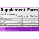 Ingredients : Other Ingredients Dried cane syrup, rice syrup, sunflower lecithin, natural flavors, sunflower oil, glycerin, malic acid, citric acid, fruit and vegetable juice for color, stevia. Does not contain: Soy, wheat, lactose, palm oil, yeast, or artificial flavors. Gluten free. Warnings Keep out of reach of children. If you are pregnant, nursing, or have a medical condition, consult your physician before using this product. Supplement Facts Serving Size: 1 chew Servings Per Container: 30 Amount Per Serving %Daily Value** Calories 20 Total Carbohydrate 4 g 1% Sugar 3 g Biotin 10,000 mcg 3333% Acai Fruit Powder 25 mg **Percent Daily Values are based on a 2000 calorie Diet Daily Value not established