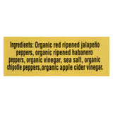 ingredients : organic red ripened jalapeno peppers;organic ripened habanero peppers;organic vinegar;sea salt;organic chipotle peppers;organic apple cider vinegar