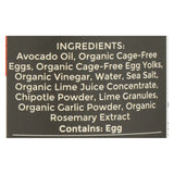 ingredients : avocado oil;organic eggs;organic egg yolks;organic vinegar;water;sea salt;organic lime juice concentrate;chipotle powder;lime granules;organic garlic powder;organic rosemary extract