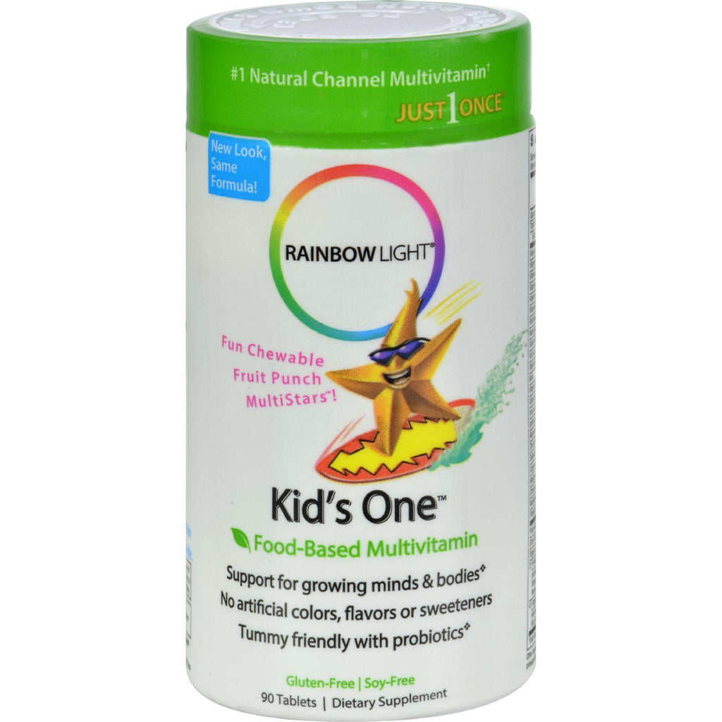Rainbow Light Kids' One MultiStars Fruit Punch Description: Chewable Multivitamin/Mineral Wholesome vegetable Concentrates 15 Million Active Probiotics Fruit Punch Flavor A great-tasting star-shaped fruit punch chewable kids are sure to love. Kids One Chewable Multivitamins/Mineral provides a balanced profile of the essential nutrients kids need for healthy growth, plus the nourishing goodness of vegetable concentrates they might not be getting from their diet alone. Probiotics are also included to support natural digestion and promote immune health. Free Of Articifical colors, flavors, sweeteners, preservatives, lactose, dairy, gluten, yeast, milk, eggs, soy, nuts, fish/shellfish and wheat. Disclaimer These statements have not been evaluated by the FDA. These products are not intended to diagnose, treat, cure, or prevent any disease.