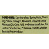Ingredients : Demineralized spring water, glycerine (veg.), soluble collagen, Hawaiian seaweed extract, polysorbate 20, citric acid, hydroxyethylcellulose, beta carotene, simethicone, potassium sorbate and sodium benzoate (preservatives).