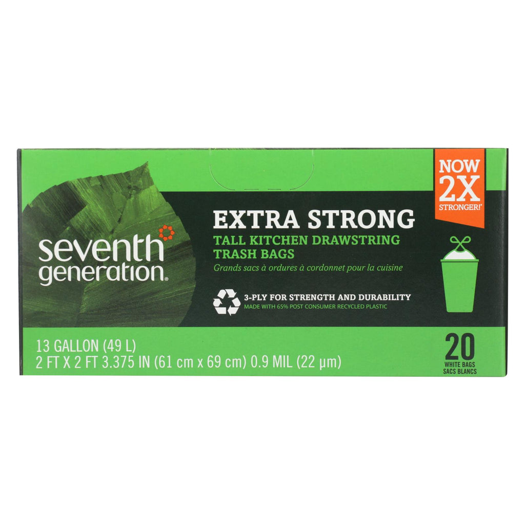 Seventh generation kitchen drawstring bags are made with 65% post-consumer recycled plastic. These twenty 13 gal. Extra strong tall kitchen drawstring trash bags are 3-ply for strength and durability, using a 3-layer technology that sandwiches recycled material between two layers of virgin plastic so these bags are tough and resistant to tearing.