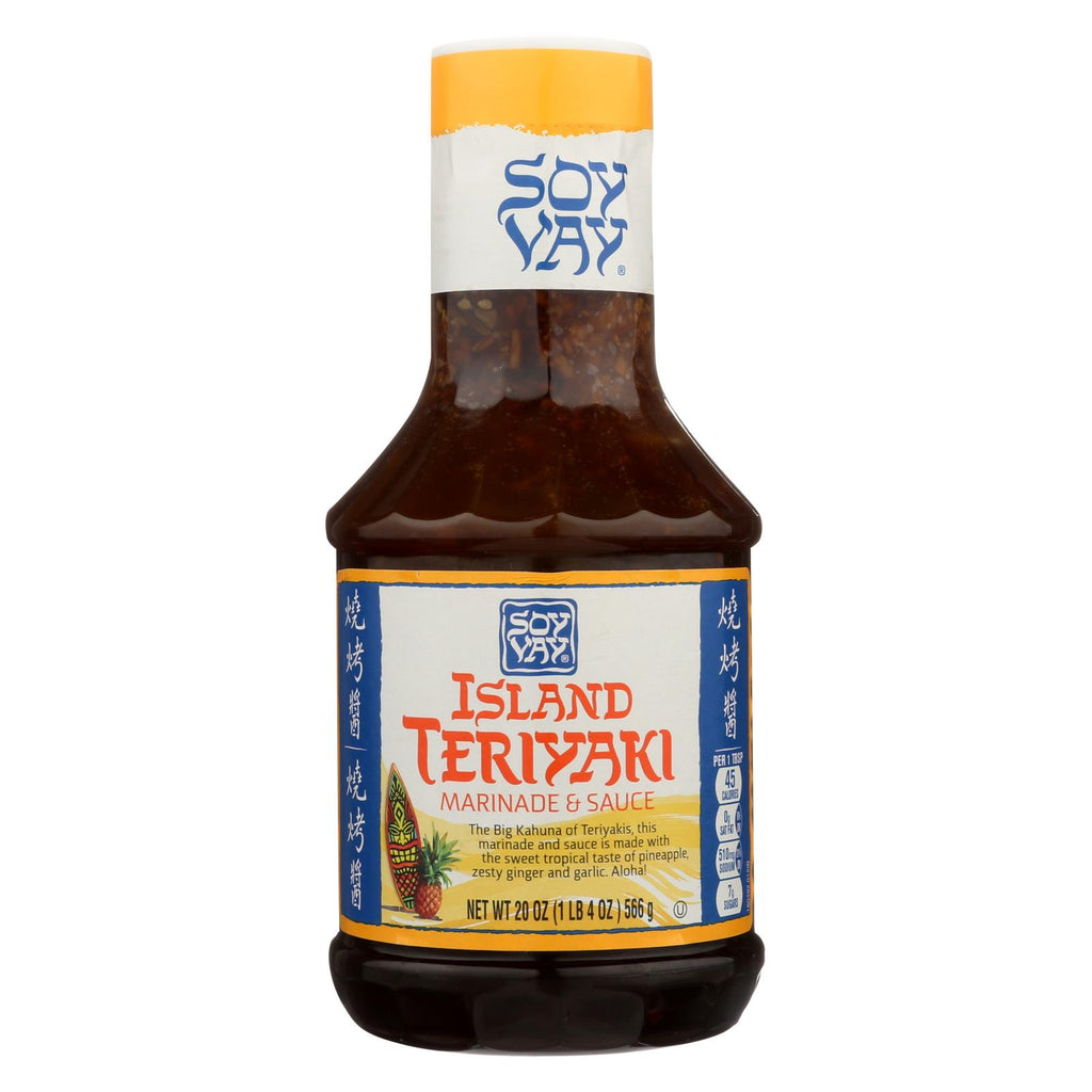 Soy vay island teriyaki marinade & sauce is bursting with distinct asian flavor accents. Our island marinade and sauce is made with the sweet and zesty tropical tastes of pineapple, ginger, and garlic. This versatile marinade and sauce is kosher and contains no high-fructose corn syrup or preservatives. Use our cholesterol and trans-fat free sauce as a marinade for meats, a dipping sauce for appetizers, or a savory sauce for grilled, broiled, or stir-fried entrees. Includes one 20 oz. Bottle of soy vay island teriyaki marinade & sauce.