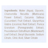 ingredients : water;aqua;glycerin;chamomilla recutita;matricaria;flower extract;cucumis sativus;cucumber;fruit extract;glycyrrhiza glabra;licorice;root extract;punica granatum;pomegranate;extract;peucedanum ostruthium;masterwort;leaf extract;decyl glucoside;sodium citrate;citric acid;silver citrate