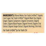 ingredients : filtered water;fair trade certifiedâ„¢ organic cane sugar;fair trade certifiedâ„¢ organic black tea;organic ginger;organic cardamom;organic cinnamon;organic cloves;organic black pepper;organic fennel;organic chai extract;organic ginger extract;organic nutmeg;citric acid