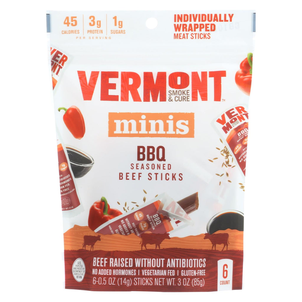 Vermont smoke & cure minis bbq seasoned beef sticks use responsibly sourced meats and simple ingredients, spices and herbs to create the finest flavor in every bite. We craft our beef bbq stick with cumin, peppers and molasses for nourishing real meat protein with deep, medium spicy taste of true bbq. The beef is raised without antibiotics or added hormones and no nitrites or nitrates are added except those naturally occurring in sea salt and celery juice powder. Includes six 0.5 oz. Vermont smoke & cure minis bbq seasoned beef sticks. At vermont smoke & cure, we've been consciously crafting delicious smoked meats and meat snacks since 1962. Our team of employee-owners makes everything in our smokehouse right here in the hills of vermont. We pride ourselves on being a good neighbor and partner to our local farmers.