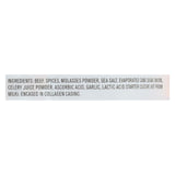 ingredients : beef;spices;molasses powder;sea salt;evaporated cane sugar;onion;celery juice powder;ascorbic acid;garlic;lactic acid starter culture;not from milk;encased in collagen casing