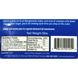 {"id":3381722052,"title":"Epic Dental Sweetener - 100 Percent Xylitol - Pouch - 5 Lb","handle":"epic-dental-sweetener-100-percent-xylitol-pouch-5-lb","description":"Sweeten Your World with (Lots of) Xylitol Hi. Im a Bigtastic Bag Full of Heatlhy Sweetness. I am Five Pounds of Tooth-Pleasing-Happiness. Im the real deal. What's not to love? Our non-GMO xylitol is perfect for low-carb diets and safe for most diabetics, and it's got 40% fewer calories than sugar. It also clobbers your mouth's icky villains and there's even a rumor that it will offer to mow your lawn. Oh, and it doesn't taste like paste. We hear that's a plus, too. DETAILS\n Substitutes 1:1 for Sugar\n All-Natural, Non-GMO Verified\n 40% Fewer Calories than Sugar\n Low Gycemic Index = Low Impact on Blood Sugar\u003cbr\u003e\u003cb\u003eIngredients : \u003c\/b\u003eServing Size: 4 grams\nServings: About 560\n\nAmount Per Serving % Daily Value\nCalories 9.6\nTotal Fat 0 g 0%\nSodium 0 g 0%\nTotal Carbohydrates 4 g 1%\nSugar Alcohol 4 g\nProtein 0 g 0%\nPercent Daily Values are based on a 2,000 calorie diet.\n\nNot a significant source of other nutrients.\n\nIngredient: Xylitol.\u003cbr\u003e\u003cb\u003eGluten Free : \u003c\/b\u003eYes\u003cbr\u003e\u003cb\u003eDairy Free : \u003c\/b\u003eYes\u003cbr\u003e\u003cb\u003eWheat Free : \u003c\/b\u003eYes\u003cbr\u003e\u003cb\u003eVegan : \u003c\/b\u003eYes\u003cbr\u003e\u003cb\u003eSize : \u003c\/b\u003e5 LB\u003cbr\u003e\u003cb\u003ePack of : \u003c\/b\u003e1\u003cbr\u003e\u003cbr\u003e\u003cb\u003eProduct Selling Unit : \u003c\/b\u003eeach","published_at":"2020-05-06T00:03:39-04:00","created_at":"2015-10-30T09:08:54-04:00","vendor":"Epic Dental","type":"Food \u0026 Beverage","tags":["Dairy Free","Gluten Free","Sweeteners","Vegan","Wheat Free"],"price":2721,"price_min":2721,"price_max":2721,"available":true,"price_varies":false,"compare_at_price":null,"compare_at_price_min":0,"compare_at_price_max":0,"compare_at_price_varies":false,"variants":[{"id":9858516420,"title":"Default Title","option1":"Default Title","option2":null,"option3":null,"sku":"HG1566785","requires_shipping":true,"taxable":true,"featured_image":{"id":2324516372531,"product_id":3381722052,"position":1,"created_at":"2018-04-14T01:58:53-04:00","updated_at":"2018-04-14T01:58:55-04:00","alt":null,"width":1600,"height":1600,"src":"\/\/yourgreenstore.myshopify.com\/cdn\/shop\/products\/HG1566785_ed22ec11-4e2d-4cf0-8817-29b097eb084e.jpg?v=1523685535","variant_ids":[9858516420]},"available":true,"name":"Epic Dental Sweetener - 100 Percent Xylitol - Pouch - 5 Lb","public_title":null,"options":["Default Title"],"price":2721,"weight":2272,"compare_at_price":null,"inventory_quantity":50,"inventory_management":"shopify","inventory_policy":"deny","barcode":"898414001054","featured_media":{"alt":null,"id":162428354611,"position":1,"preview_image":{"aspect_ratio":1.0,"height":1600,"width":1600,"src":"\/\/yourgreenstore.myshopify.com\/cdn\/shop\/products\/HG1566785_ed22ec11-4e2d-4cf0-8817-29b097eb084e.jpg?v=1523685535"}},"requires_selling_plan":false,"selling_plan_allocations":[],"quantity_rule":{"min":1,"max":null,"increment":1}}],"images":["\/\/yourgreenstore.myshopify.com\/cdn\/shop\/products\/HG1566785_ed22ec11-4e2d-4cf0-8817-29b097eb084e.jpg?v=1523685535","\/\/yourgreenstore.myshopify.com\/cdn\/shop\/products\/HG1566785_1.jpg?v=1523685536"],"featured_image":"\/\/yourgreenstore.myshopify.com\/cdn\/shop\/products\/HG1566785_ed22ec11-4e2d-4cf0-8817-29b097eb084e.jpg?v=1523685535","options":["Epic Dental Sweetener - 100 Percent Xylitol - Pouch - 5 Lb"],"media":[{"alt":null,"id":162428354611,"position":1,"preview_image":{"aspect_ratio":1.0,"height":1600,"width":1600,"src":"\/\/yourgreenstore.myshopify.com\/cdn\/shop\/products\/HG1566785_ed22ec11-4e2d-4cf0-8817-29b097eb084e.jpg?v=1523685535"},"aspect_ratio":1.0,"height":1600,"media_type":"image","src":"\/\/yourgreenstore.myshopify.com\/cdn\/shop\/products\/HG1566785_ed22ec11-4e2d-4cf0-8817-29b097eb084e.jpg?v=1523685535","width":1600},{"alt":null,"id":162428387379,"position":2,"preview_image":{"aspect_ratio":1.0,"height":1600,"width":1600,"src":"\/\/yourgreenstore.myshopify.com\/cdn\/shop\/products\/HG1566785_1.jpg?v=1523685536"},"aspect_ratio":1.0,"height":1600,"media_type":"image","src":"\/\/yourgreenstore.myshopify.com\/cdn\/shop\/products\/HG1566785_1.jpg?v=1523685536","width":1600}],"requires_selling_plan":false,"selling_plan_groups":[],"content":"Sweeten Your World with (Lots of) Xylitol Hi. Im a Bigtastic Bag Full of Heatlhy Sweetness. I am Five Pounds of Tooth-Pleasing-Happiness. Im the real deal. What's not to love? Our non-GMO xylitol is perfect for low-carb diets and safe for most diabetics, and it's got 40% fewer calories than sugar. It also clobbers your mouth's icky villains and there's even a rumor that it will offer to mow your lawn. Oh, and it doesn't taste like paste. We hear that's a plus, too. DETAILS\n Substitutes 1:1 for Sugar\n All-Natural, Non-GMO Verified\n 40% Fewer Calories than Sugar\n Low Gycemic Index = Low Impact on Blood Sugar\u003cbr\u003e\u003cb\u003eIngredients : \u003c\/b\u003eServing Size: 4 grams\nServings: About 560\n\nAmount Per Serving % Daily Value\nCalories 9.6\nTotal Fat 0 g 0%\nSodium 0 g 0%\nTotal Carbohydrates 4 g 1%\nSugar Alcohol 4 g\nProtein 0 g 0%\nPercent Daily Values are based on a 2,000 calorie diet.\n\nNot a significant source of other nutrients.\n\nIngredient: Xylitol.\u003cbr\u003e\u003cb\u003eGluten Free : \u003c\/b\u003eYes\u003cbr\u003e\u003cb\u003eDairy Free : \u003c\/b\u003eYes\u003cbr\u003e\u003cb\u003eWheat Free : \u003c\/b\u003eYes\u003cbr\u003e\u003cb\u003eVegan : \u003c\/b\u003eYes\u003cbr\u003e\u003cb\u003eSize : \u003c\/b\u003e5 LB\u003cbr\u003e\u003cb\u003ePack of : \u003c\/b\u003e1\u003cbr\u003e\u003cbr\u003e\u003cb\u003eProduct Selling Unit : \u003c\/b\u003eeach"}