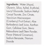 ingredients : water;aqua;glycerin;silica;xylitol;erythritol;lauryl glucoside;sodium methyl cocoyl taurate;zinc citrate;vaccinium macrocarpon;cranberry;fruit extract;aloe barbadensis leaf juice;xanthan gum;cellulose gum;stevia rebaudiana leaf/ stem powder;flavor;natural cinnamon;sodium benzoate;titanium dioxide