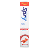 The newly formulated spry fluoride-free cinnamon toothpaste features the greatest, most natural ingredients to ensure you have a healthy mouth. It is rich in xylitol, a natural sweetener, which is clinically proven to improve oral health by managing the microbiome in the mouth in the healthiest way possible. Xylitol does this by inhibiting cavity-causing bacteria from sticking to teeth and gums. Xylitol also moisturizes, helping to cleanse your mouth, and reduce dry mouth discomfort. Spry toothpaste now features cranberry extract for its natural anti-plaque and tartar control benefits. Aloe is also included to soothe your delicate oral tissues. The new and improved formula is paraben-free and sorbitol-free. Includes one 5 oz. Tube of spry fluoride-free cinnamon toothpaste.
