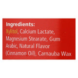ingredients : xylitol;calcium lactate;magnesium stearate;gum arabic natural flavor;cinnamon oil;carnauba wax